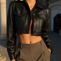 Füge deiner Garderobe mit dieser Cropped Jacke eine fertige, kantige Note hinzu. Das glänzende PU-Material, der klassische Kragen und die auffälligen Brusttaschen mit Druckknöpfen sorgen für einen kraftvollen, modischen Look. Ob du sie nun mit einem Abendkleid oder einer lässigen Jeans kombinierst, diese Jacke hebt jedes Outfit auf ein neues Level.