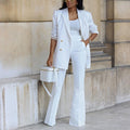 Stap in verfijning met deze chique blazer en wijde pijpen broek set. Perfect op maat gemaakt, deze set brengt vertrouwen en tijdloze stijl naar elke gelegenheid. De set is ideaal voor zowel formele als casual evenementen, en zorgt voor een verfijnde uitstraling, ongeacht de gelegenheid.