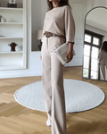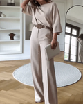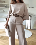 Deze elegante twee-delige set bestaat uit een top met een ontspannen pasvorm en een op maat gemaakte wijde broek. Het creëert een chique silhouet, ideaal voor zowel werk als sociale evenementen. Deze veelzijdige set combineert stijl met comfort, zodat je er altijd op je best uitziet.