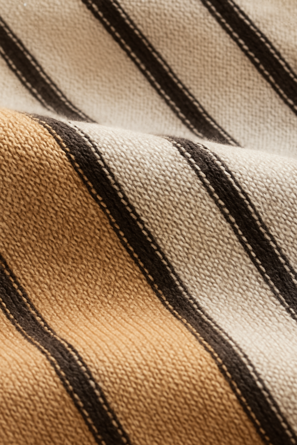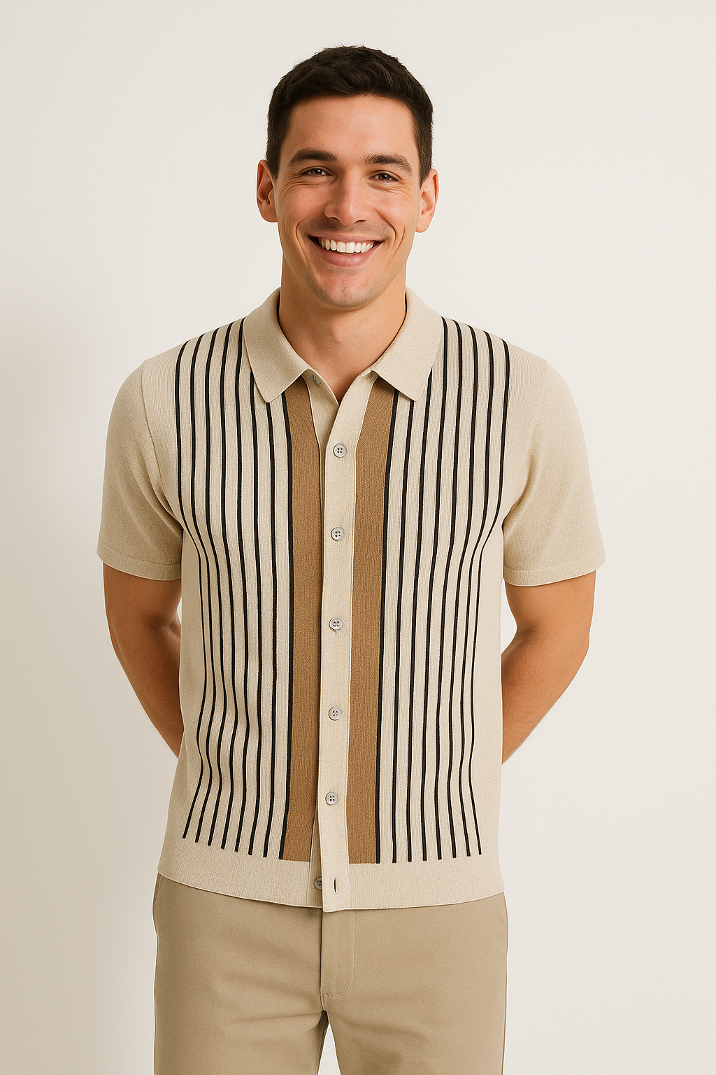 Deze Fijngebreide Korte Polo met Strepen en Vintage Look geeft jouw outfit een stijlvolle retro-uitstraling. De zachte gebreide stof en verticale strepen in beige- en bruintinten zorgen voor een flatterende, slanke look met een vleugje vintage. De klassieke polokraag met knoopsluiting maakt dit shirt veelzijdig en geschikt voor zowel casual als alledaagse gelegenheden. Het comfortabele materiaal zorgt ervoor dat je dit shirt het liefst elke dag draagt.