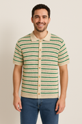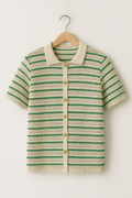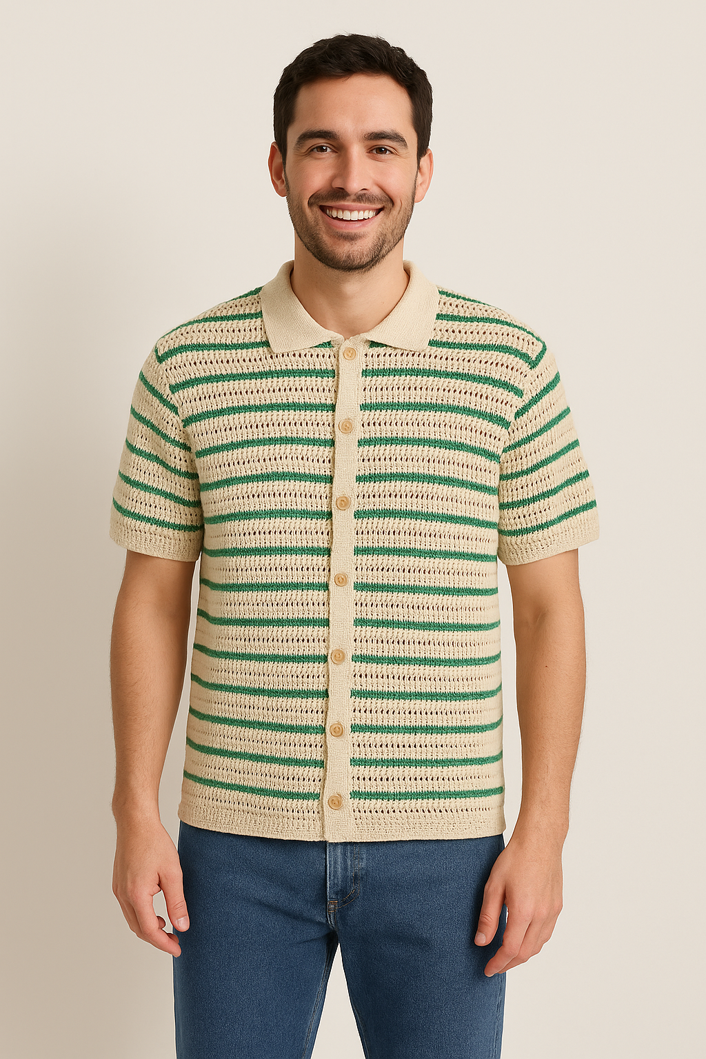 Dit Gehaakte Overhemd met Korte Mouwen en Strepen brengt een vleugje retro stijl in je zomergarderobe. Het opengehaakte patroon zorgt voor optimale luchtcirculatie, zodat je koel blijft op warme dagen. De groene strepen op een crèmekleurige achtergrond geven het overhemd een frisse en natuurlijke uitstraling. De klassieke kraag met knoopsluiting maakt het design compleet en veelzijdig voor iedere zomerse gelegenheid.