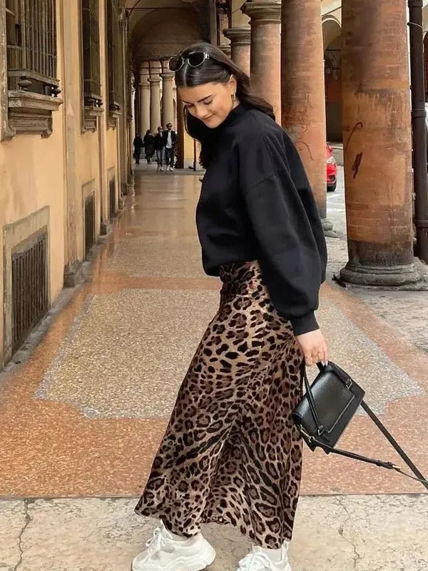 Ontdek deze Maxi Rok in Panterprint, een elegante maxirok met een opvallende luipaardprint. Gemaakt van glanzende satijnen stof met een vloeiende pasvorm voor een dynamische look. De uitlopende rok en elastische tailleband combinatie maken hem zowel stijlvol als comfortabel. Perfect voor gedurfde dag- of avondoutfits.