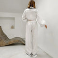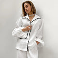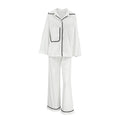 Deze tweedelige dames pyjama set is gemaakt voor vrouwen die stijl én comfort willen combineren. De set bestaat uit een losvallende jas met lange mouwen en een wijde broek – ideaal voor ontspannen dagen en knusse avonden. De contrasterende paspels geven de klassieke look een moderne en verfijnde twist. Gemaakt van ademende katoenmix voor ultiem draagcomfort, nacht en dag.